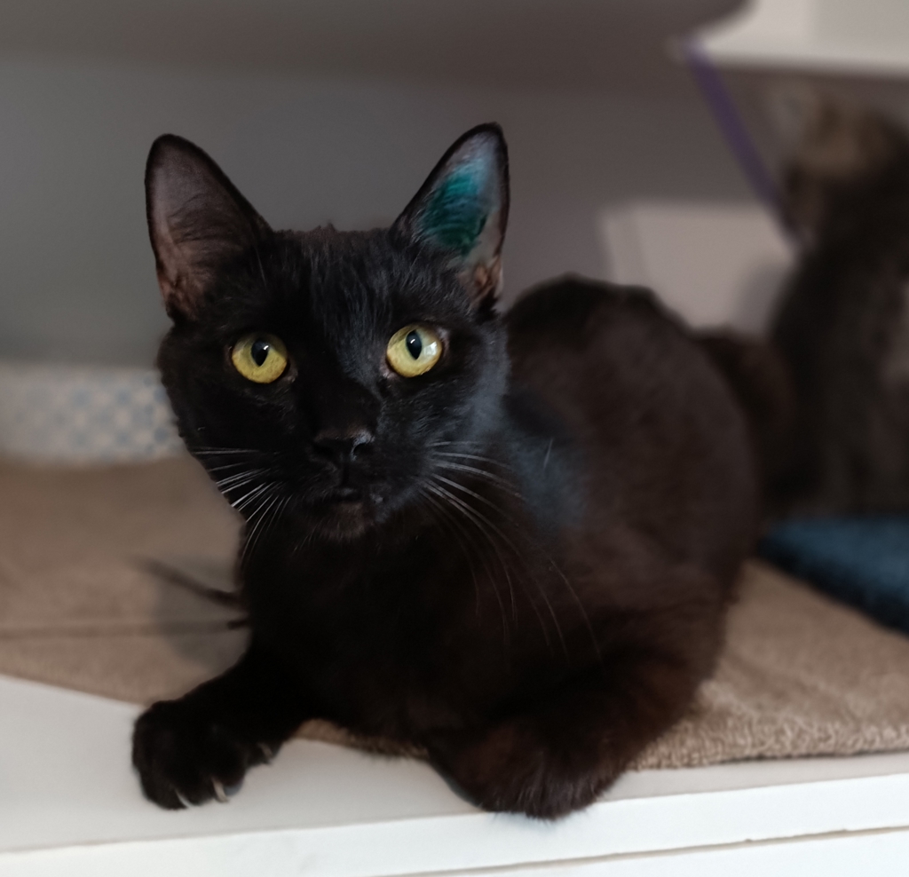 Meet Miso, a sweet and social female black domestic shorthair cat who is looking for her forever home. Miso is a loving and nurturing cat who recently raised a litter of lovely kittens and is now ready to find a family of her own. She is sleek and elegant with a shiny black coat and piercing yellow eyes that will capture your heart.