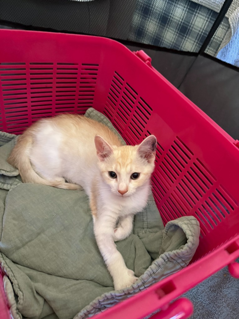 Chomp doesn't enjoy being picked up, but enjoys pats when he's eepy. He's still learning to trust humans after his entry to life, but is getting more curious every day! He especially likes when the bigger cats let him hang out with them.