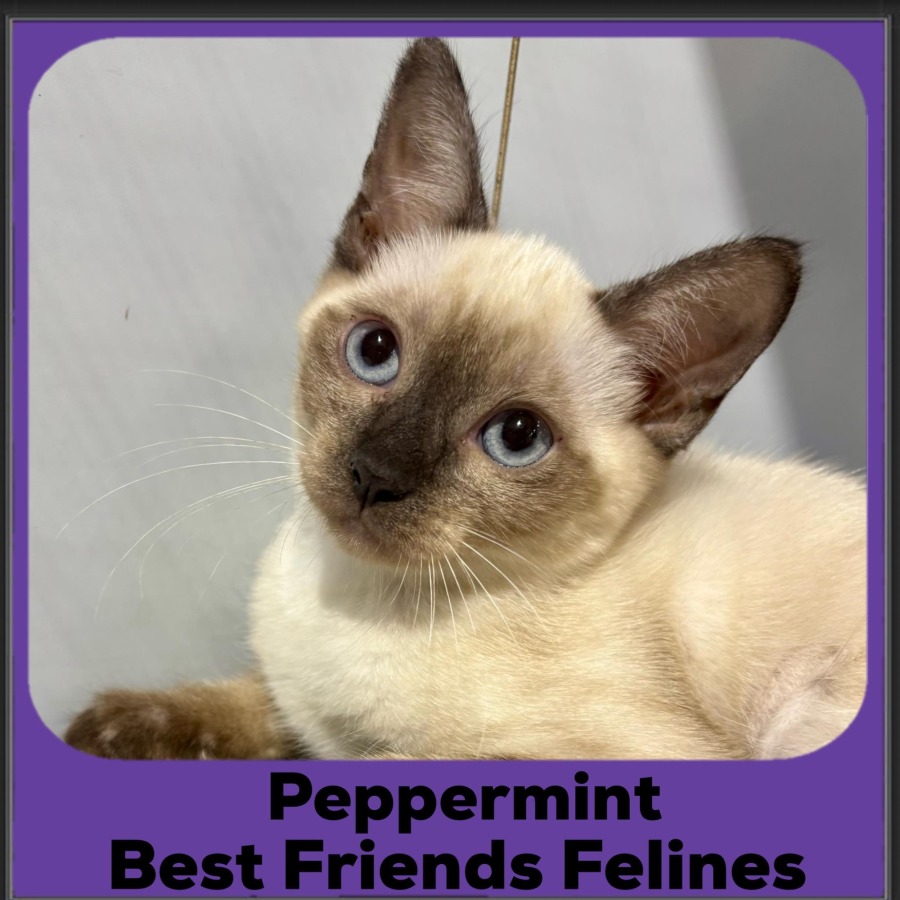 Why, hello there! I’m Peppermint, do you want to play? Peppermint is a delightful kitten, the full package; a sweet temperament, playful but gentle—she never fails to bring a smile to your face. When you cuddle Peppermint and she starts to purr, you’ll be enraptured. Peppermint delights in playing with other kittens and a variety of toys, most recently a ball with a bell in it, along with a tunnel to zoom through and occasionally nap in. Peppermint is a sweetheart and would suit a variety of household types.