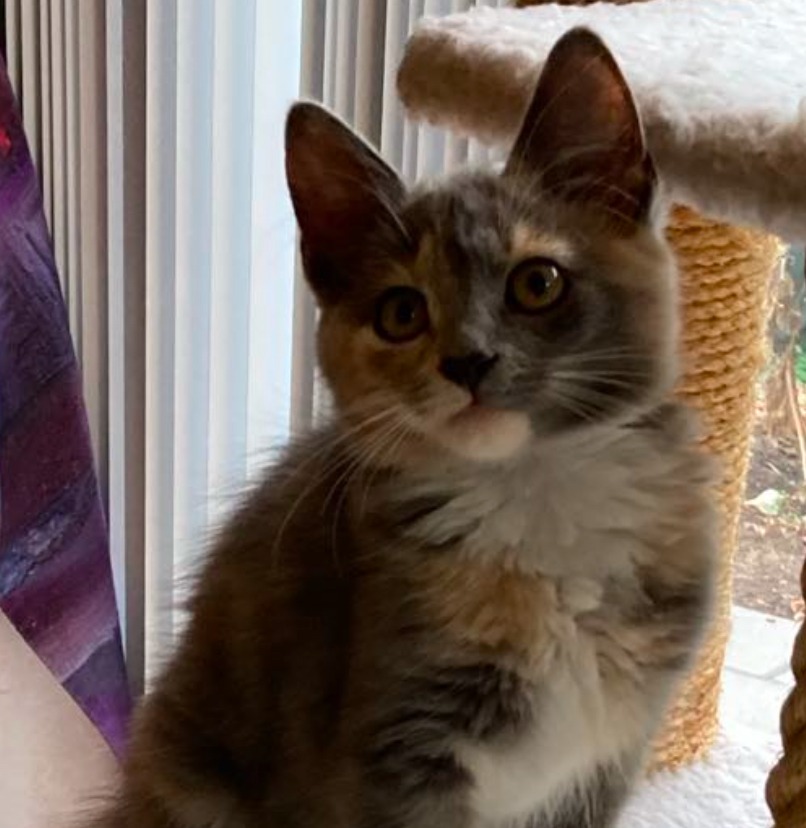 - Dusty is cute in her grey and tan coat, white bib & socks. She has bright, inquisitive eyes and a quiet meow, which she uses sparingly.