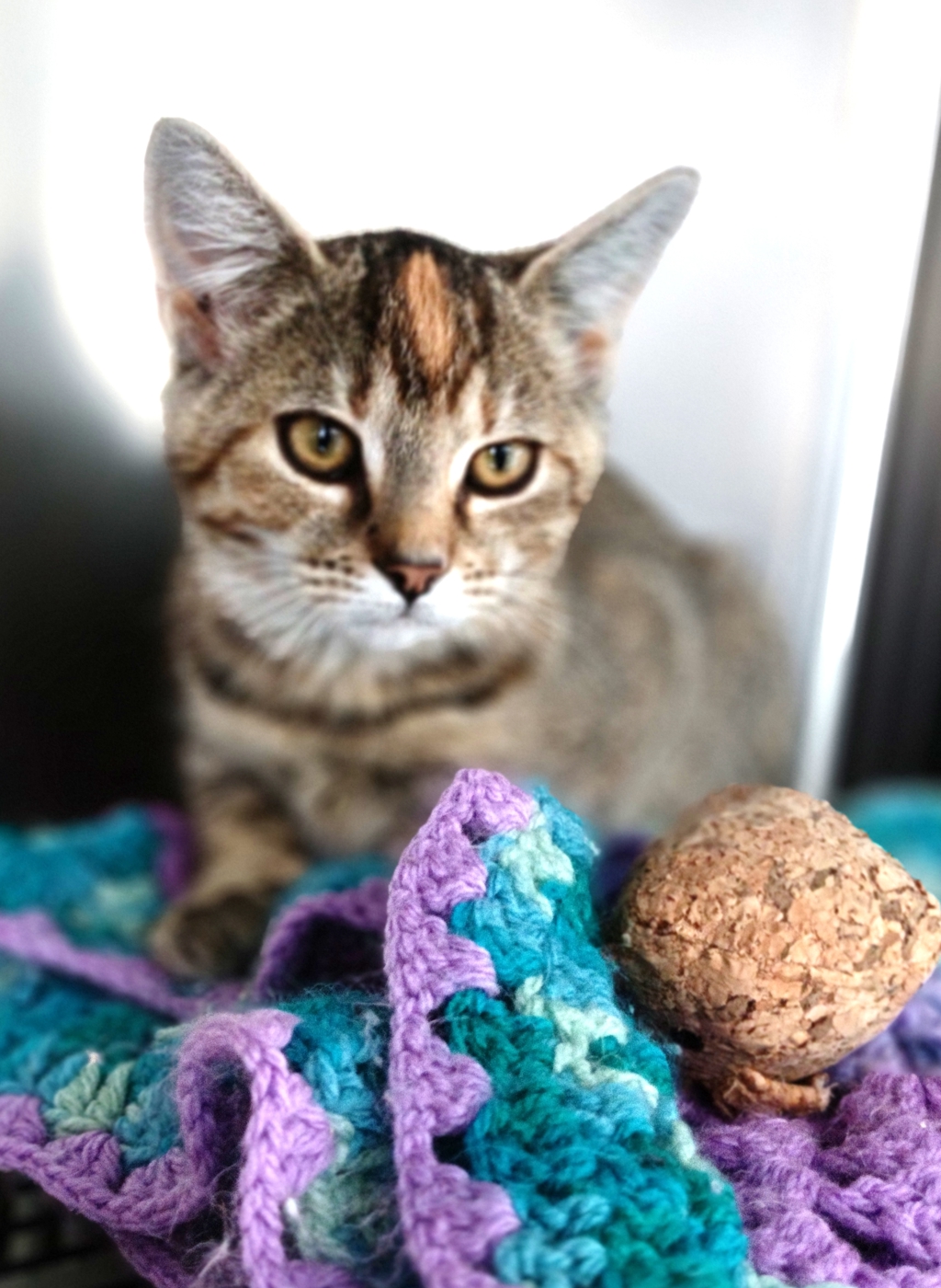 Patsy is a beautiful 3-month-old tabby torti with a sweet, gentle nature. She may be a bit shy when first meeting new people, but once she's comfortable, her affectionate personality will shine through. Patsy is looking for a calm and loving home where she can feel safe and secure while she grows and learns to trust.