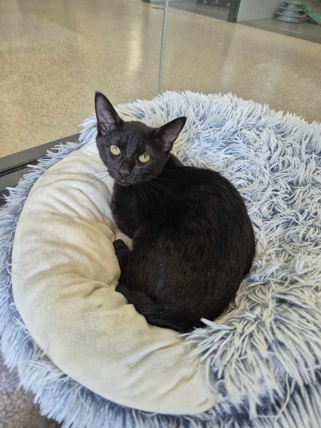Smokey is a stunning, sleek, black kitten with a shiny coat and an even brighter personality, waiting to find his very first forever home. While he might take a little time to feel at ease in a new space, Smokey is a total lovebug who adores snuggling up with his siblings and finding the coziest spots to relax.