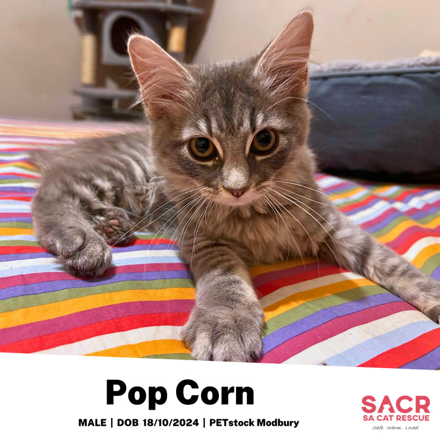 Pop Corn's adoption fee is $195 which includes desexing, microchipping, parasite prevention, and initial F3 vaccination.