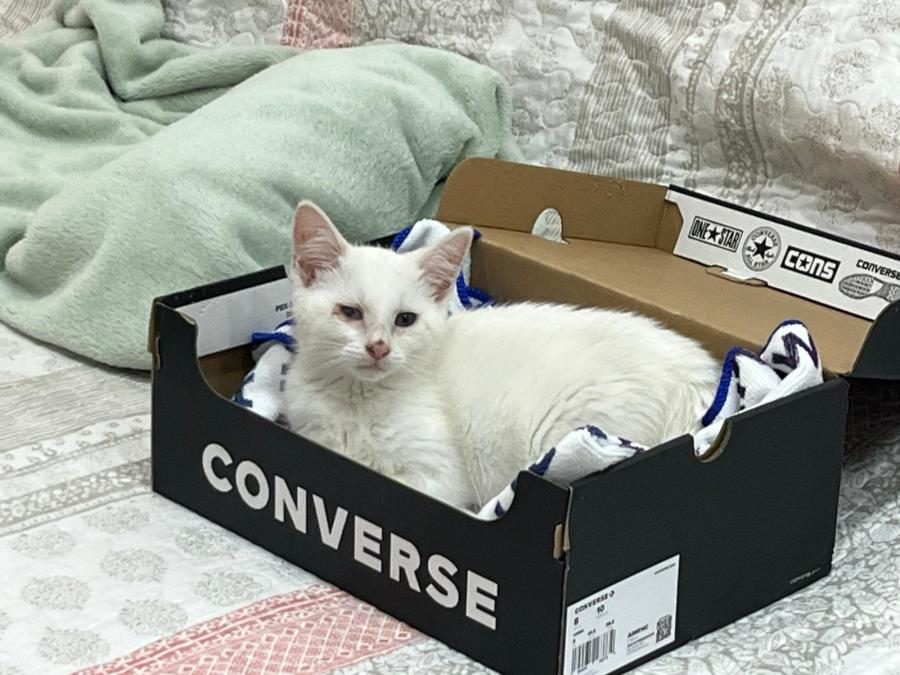 Lucy is a sweet, white bundle of love who exudes charm and playful energy. At just 13.5 weeks old, her playful personality and endless purrs are guaranteed to melt your heart. She thrives on affection and enjoys cuddling up with her humans, showing that she integrates well with both people and other cats. This little adventurer is eager to explore her surroundings, proving that she's just as lively and spirited as any other kitten her age.