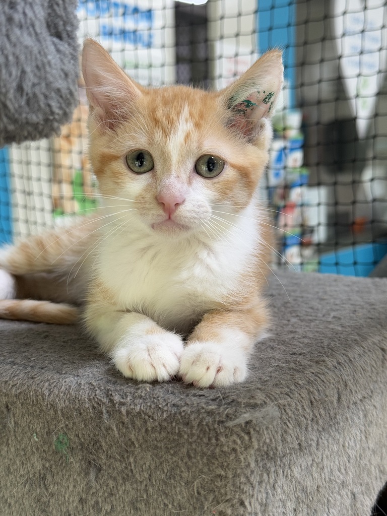 I am a cute ginger and white tabby and who doesn't like a ginger? I was in foster care after being brought into the RSPCA so I am very well socialised with people and the family had a lot of cats and a big dog, so I should fit in well with any new home. I am a great little kitten, loving to play and be smoochy, so if you want a new family member, please come and meet me.