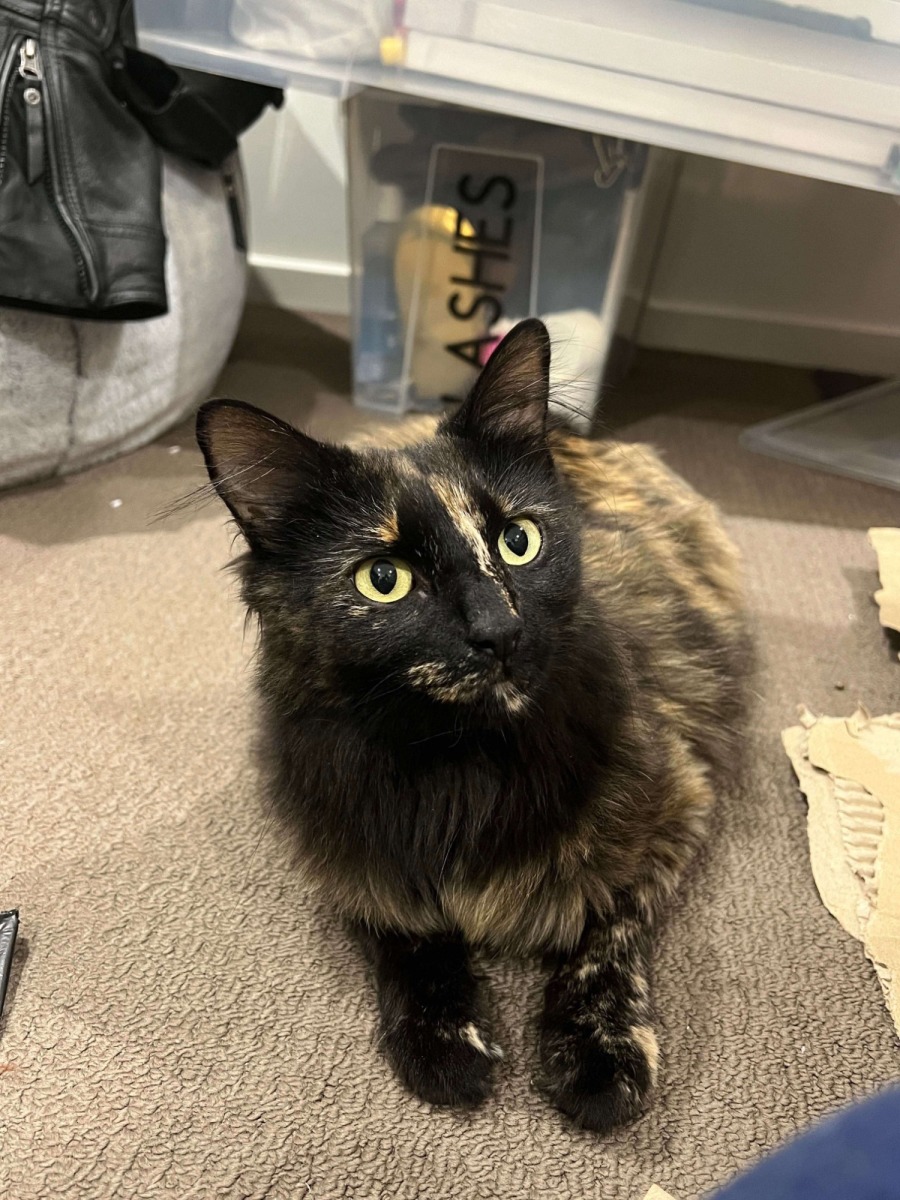 Meet Skunk, a delightful 1.5-year-old tortoiseshell cat with a medium-length, beautifully patterned coat that catches every beam of sunlight. Her friendly and cheerful personality shines through in everything she does. Whether she’s trotting around with her tail high and wagging as a familiar face enters the room or purring contentedly on a lap Skunk,is always delighted to see you.