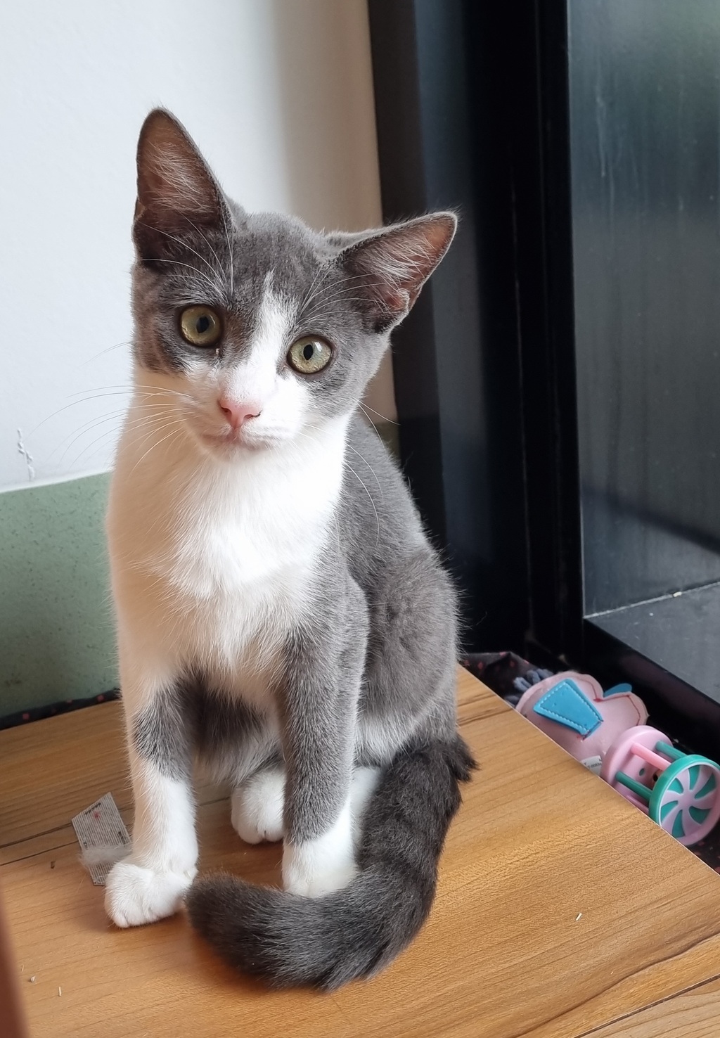 Hi there, I'm Grayson. I'm just a kitten, but don't let my size fool you, I've got a big heart. I'm a bit shy, but once I get to know you, I'm all purrs and play. I love to explore, my curiosity knows no bounds! I'm sweet and friendly, always ready for a gentle pat or a game of chase the wand toy. I do prefer a quiet home, though. Too much noise can be a bit overwhelming. Adopting me means gaining a loyal friend. I promise to bring joy, laughter, and lots of love into your life.