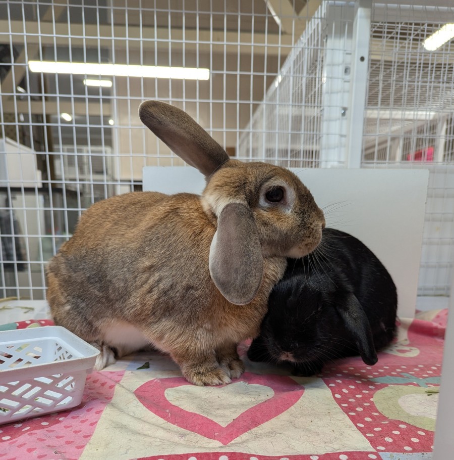 In contrast, Frankie represents the duo's quieter side. He's a bit smaller and more reserved, but his gentle demeanour is a treasure. Often tucked behind Pearl for comfort, Frankie might seem shy at first, but with a bit of patience, his gentle charm and affection become evident. When Frankie warms up, he adds his own sweet flair to the partnership. Together, they're a clean and harmonious bunny pair who've mastered the art of living contentedly together.