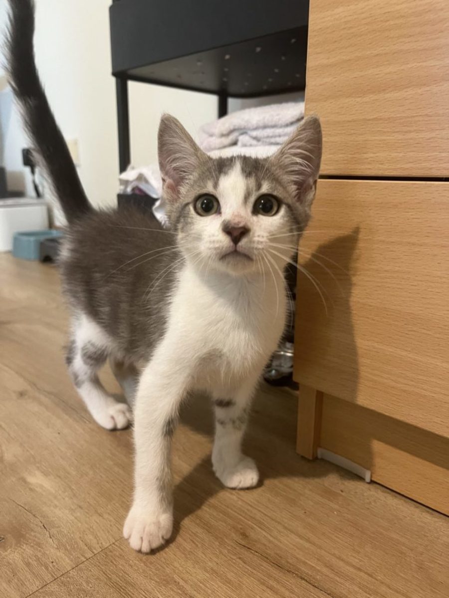 Frappe is a sweet and cuddly grey and white kitten who loves nothing more than curling up in your lap for a cozy nap. He’s laid-back and affectionate, always ready to snuggle up for some quality cuddle time. When he's not snoozing in your lap, Frappe enjoys playing and will happily keep you company throughout the day. With his love for affection, he’s the perfect companion for anyone looking for a snuggly friend.