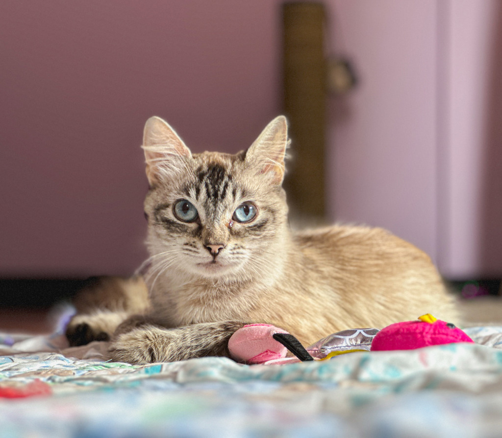 She is the queen of head bang smooching and marching on whatever her little paws can get snuggled into. She absolutely loves toys and plays for hours.