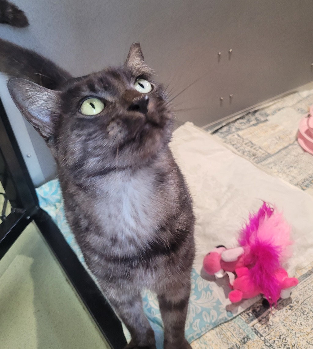 Hello there! My name is Veronica, and I'm a sweet, independent lady looking for my perfect home. I might not be the biggest fan of being picked up or cuddled all the time, but that doesn't mean I don't enjoy spending time with you! I'm a quiet girl, so I'd love a peaceful home where I can have a little space when I need it. I think I'd be great with older children who understand when I want some alone time, but also know that I do enjoy some love and attention-especially when you're watching TV! I'm all about getting those lovely pats and gentle affection, and I'll happily sit by your side, keeping you company. If you're looking for a sweet, low-maintenance companion to share quiet moments with, I might just be the purrfect match!