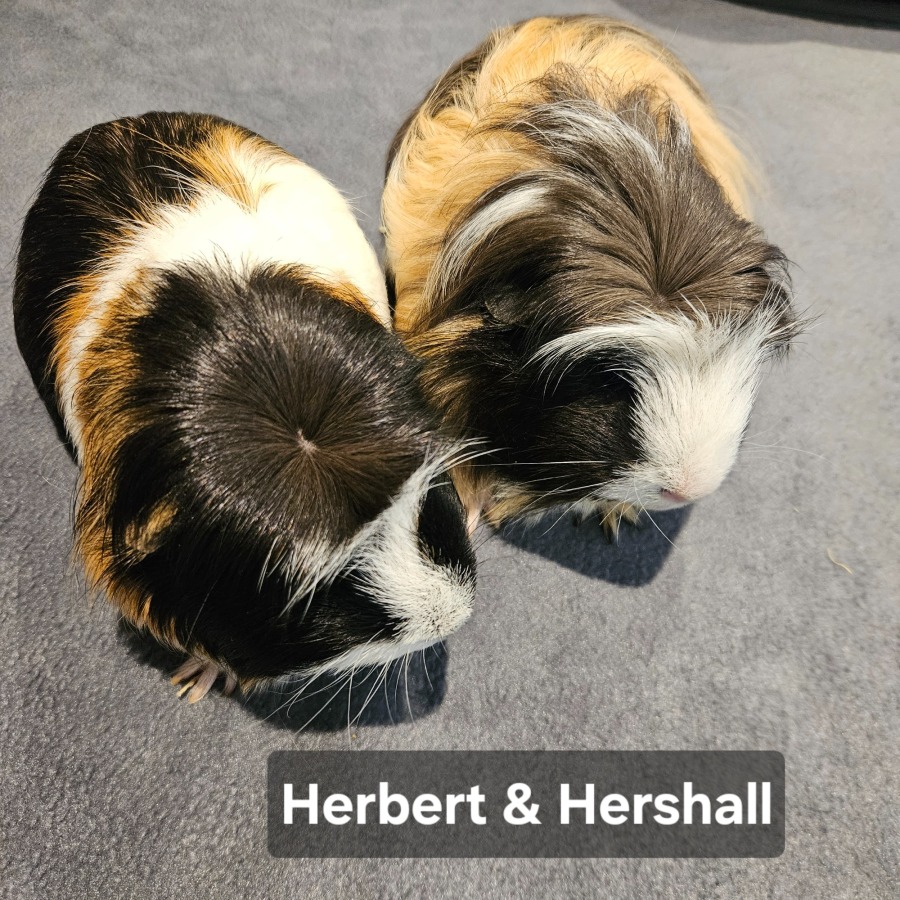 Meet Herbert (1 year on left) and Hershall (1 1/2 years on right). These beautiful boys love their food! They are a little shy, especially when you go to pick them up, but love a cuddle and a chin scratch on your lap They are very much bonded and do not like to be seperated for too long.