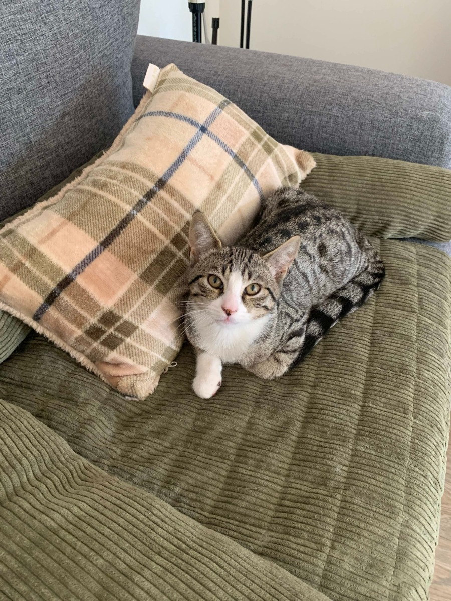 I spend most of the day snoring away in my hammock next to my foster mum’s desk, waking up occasionally for a little chin or butt scratch. I love attention and will flop over in the funniest positions, desperately hoping you’ll come over and dote on me for a bit. Like all kittens, I love to play! My big foster siblings will entertain me, but I have no problems making my own fun here and there either.