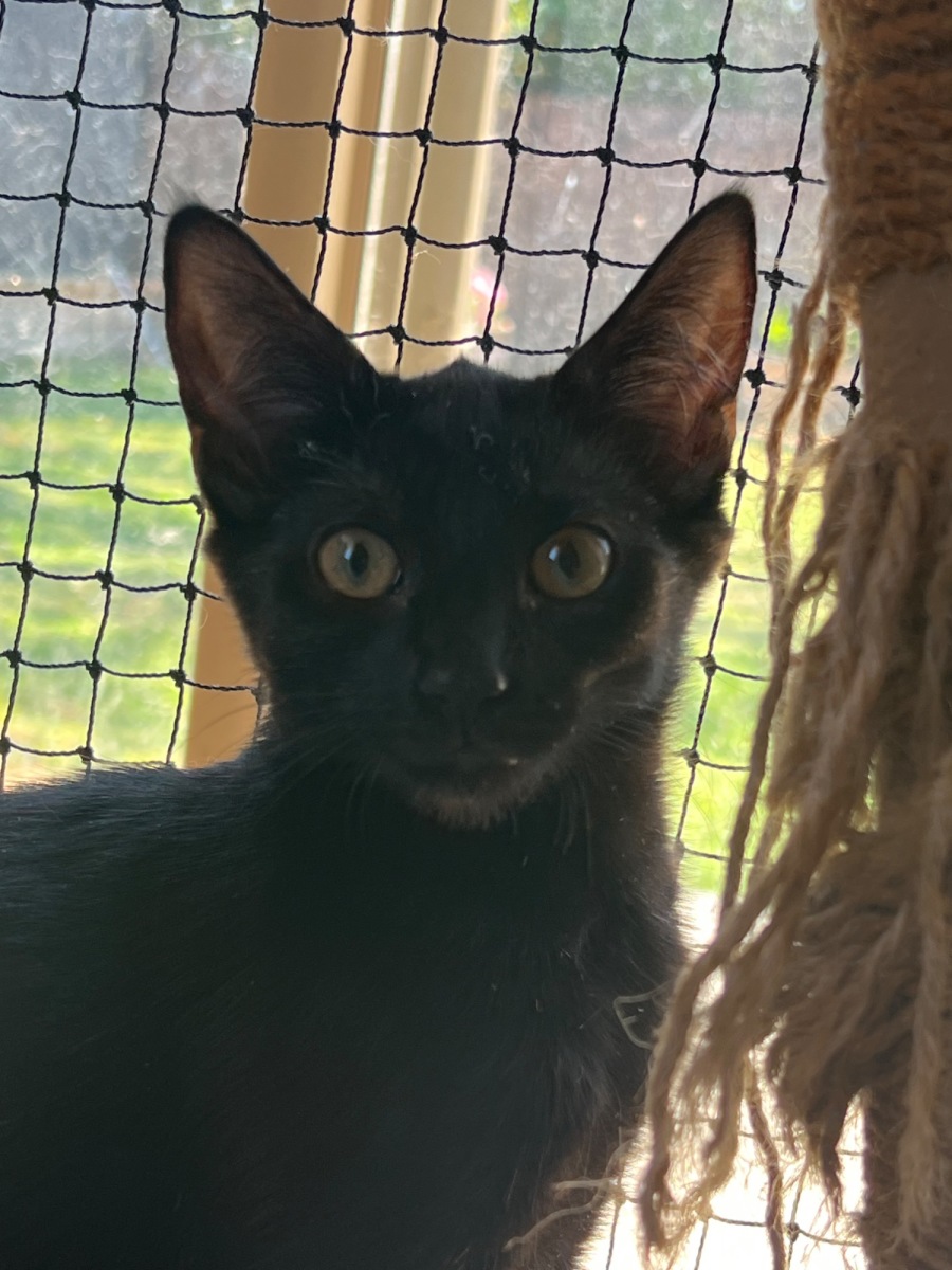 As Spider is a totally black kitten she is available to an indoor only home for her safety. She may like an outdoor enclosure when she grows up to allow her to explore safely.