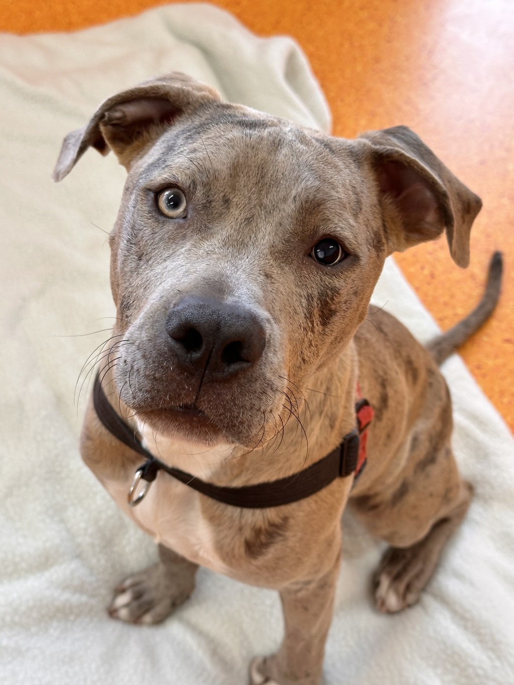 Meet Blaze, an affectionate 8-month-old American Staffordshire Bull Terrier eager to find his forever home! This sensitive boy thrives on companionship and would love to be part of an indoor family. Blaze is still learning his basic manners and would benefit from a family committed to his ongoing training. He can get a bit bouncy with excitement, so enrichment activities and crate training will help him feel secure and engaged.