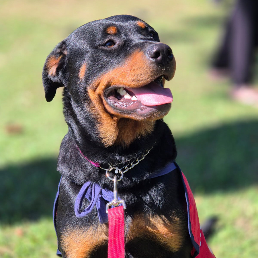 Sapphire loves the company of humans, male or female, and has already learnt her basic manners. Clever and keen to please, she walks well on a lead, sits on command and comes when called, but she is capable of learning much more. She would make a great companion for a strong and confident Rottie lover who wants to take her training to the next level.