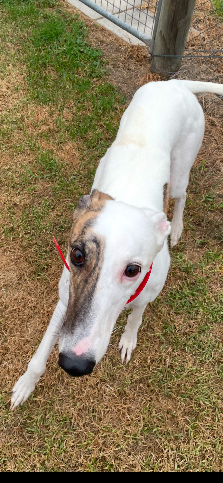 Caroline is adorable full to the top with happiness that she would love to share with a family. Caroline has not been cat tested. She is not interested or fast enough to race she is considered a pup and will need to learn everything about living a domestic life.