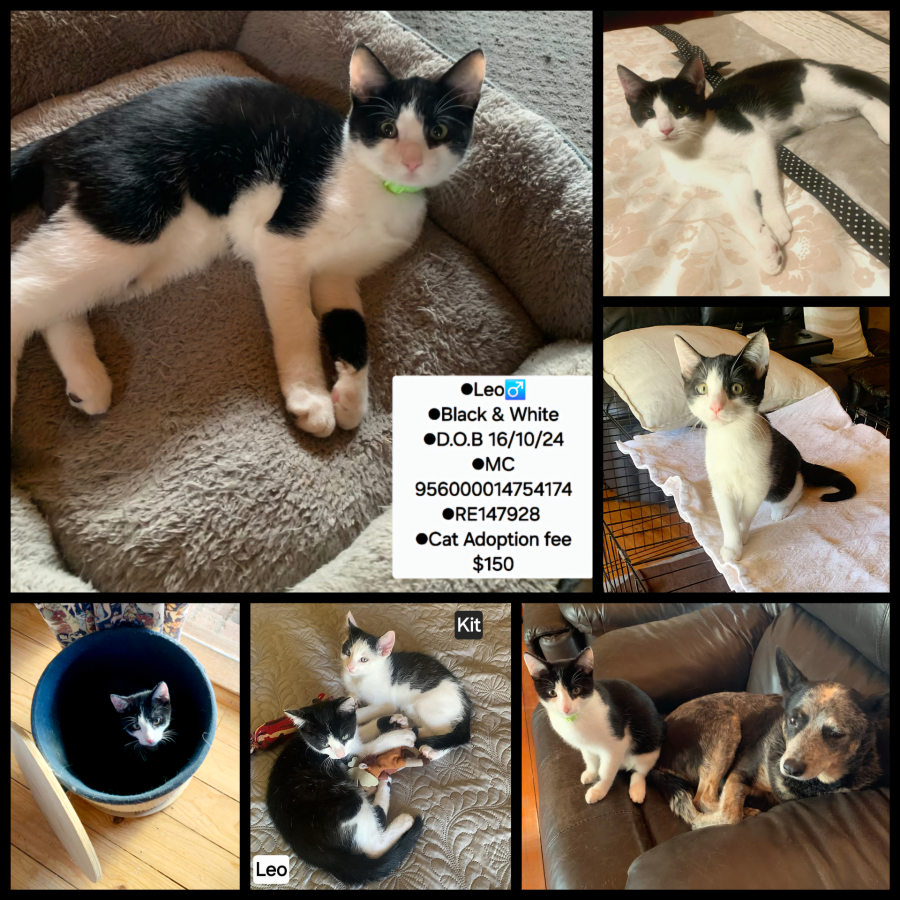 We would prefer to adopt Leo out with his sibling Kit or into a household that already has pets as he was born into a cat colony and has lived his short life so far surrounded by other pets including cattle dogs and a Maremma.