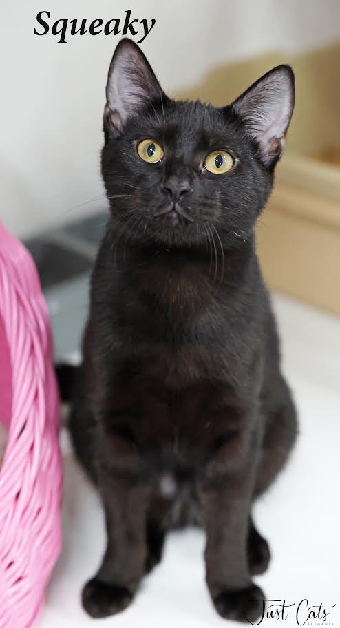 Squeaky is a gorgeous black kitten with a big personality! Bursting with energy and curiosity, she loves to run, jump, and wrestle with her sister, Skippy. She’s playful, cheeky, and always looking for fun, whether it’s chasing a toy, climbing to new heights, or zooming around the room.