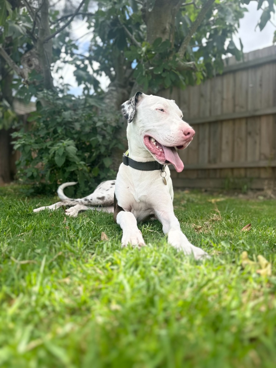 Due to his light fur and pink nose, regular sunscreen application is essential to prevent sunburn and cancer. Crius enjoys water activities and demonstrates improving recall off-leash. As a versatile and affectionate companion, Crius would be an excellent addition to any family.