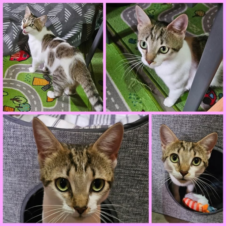 Spirit is estimated to be 10 months old (DOB 15/3/2024) having been a very young mum. Spirit raised two beautiful kittens - Collie & Callie that are in the process of being adopted together.