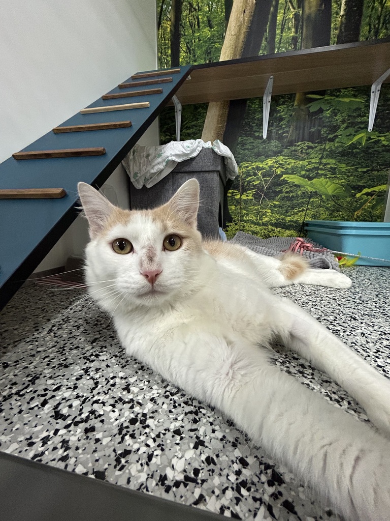 Hello, I'm Slinky. I'm as mellow as a cat can be, a gentle soul who loves nothing more than a warm lap and a quiet corner. My days are simple, filled with soft purrs and contented naps. I will need a home without young children, they are a bit too noisy for me! I've been told I have a sweet nature, that my gentleness is soothing. I don't ask for much, just a serene home where I can share my calm and comforting presence. My purrs are a lullaby, my slow blinks a sign of trust. I'm not one for mischief or mayhem, preferring tranquility over tomfoolery. Adopt me if you need a soothing, gentle companion to share your peaceful moments with.