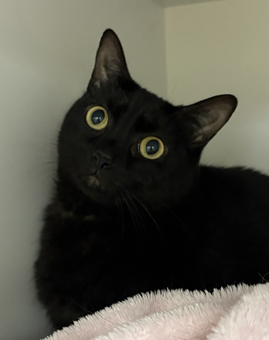 Monica is a beautiful black cat who may be timid at first but soon shows her loving and gentle nature. She shares a special bond with her sister, Maybell, who is also available for adoption.