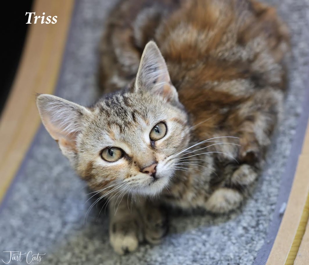Triss is a stunning 14-week-old tabby tortie kitten with a playful and adventurous spirit. Born to a stray mum and raised in a loving home, she has blossomed into a sweet and affectionate little girl. Triss loves to explore her surroundings, chase after toys, and curl up for snuggles when she’s ready to rest. She’s looking for a forever home where she can share her love and playful energy. Come and meet her at our Longford Adoption Centre!