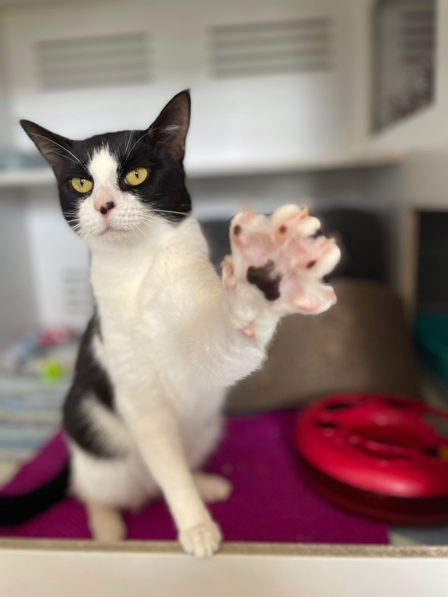 Sparkles is a gentle and loving soul who’s sure to bring joy to any home, especially with someone who understands her need for a calm and patient environment initially as she builds her confidence. Once she knows you, she’ll climb all over you for cuddles and will even drool as she gets pats. She also loves other cats – she adores playing with them and lounging around with them, soaking up all the cuddles.