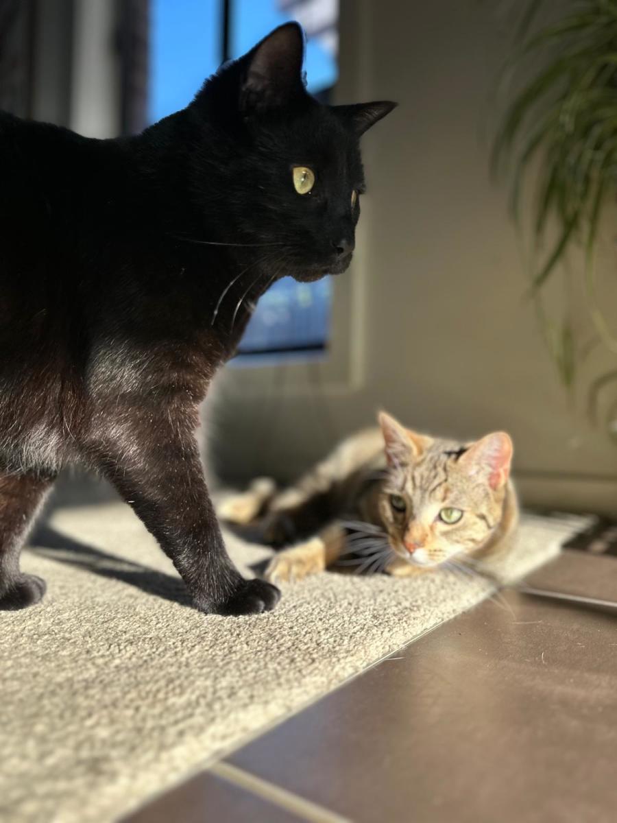 On the other paw, Oni is a spirited feline with a predilection for play. Her love for stalking and pouncing showcases her energetic nature. Though she may be a bit reserved initially, time and patience will reveal her softer side and unique way of expressing affection. Oni’s playful nature complements Nookie's affectionate personality, making them a perfect pair that brings a balance of vivacity and warmth to their home.