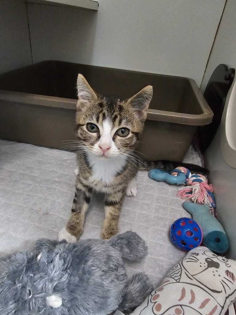 Hey there, I'm Waffle. I'm a friendly and affectionate kitten who would suit most homes! My playful paws are always ready to pounce on anything that moves. I love playing with wand toys and mysterious shadows on the wall! When I'm finished playing, I love nothing more than finding a warm lap to curl up in.