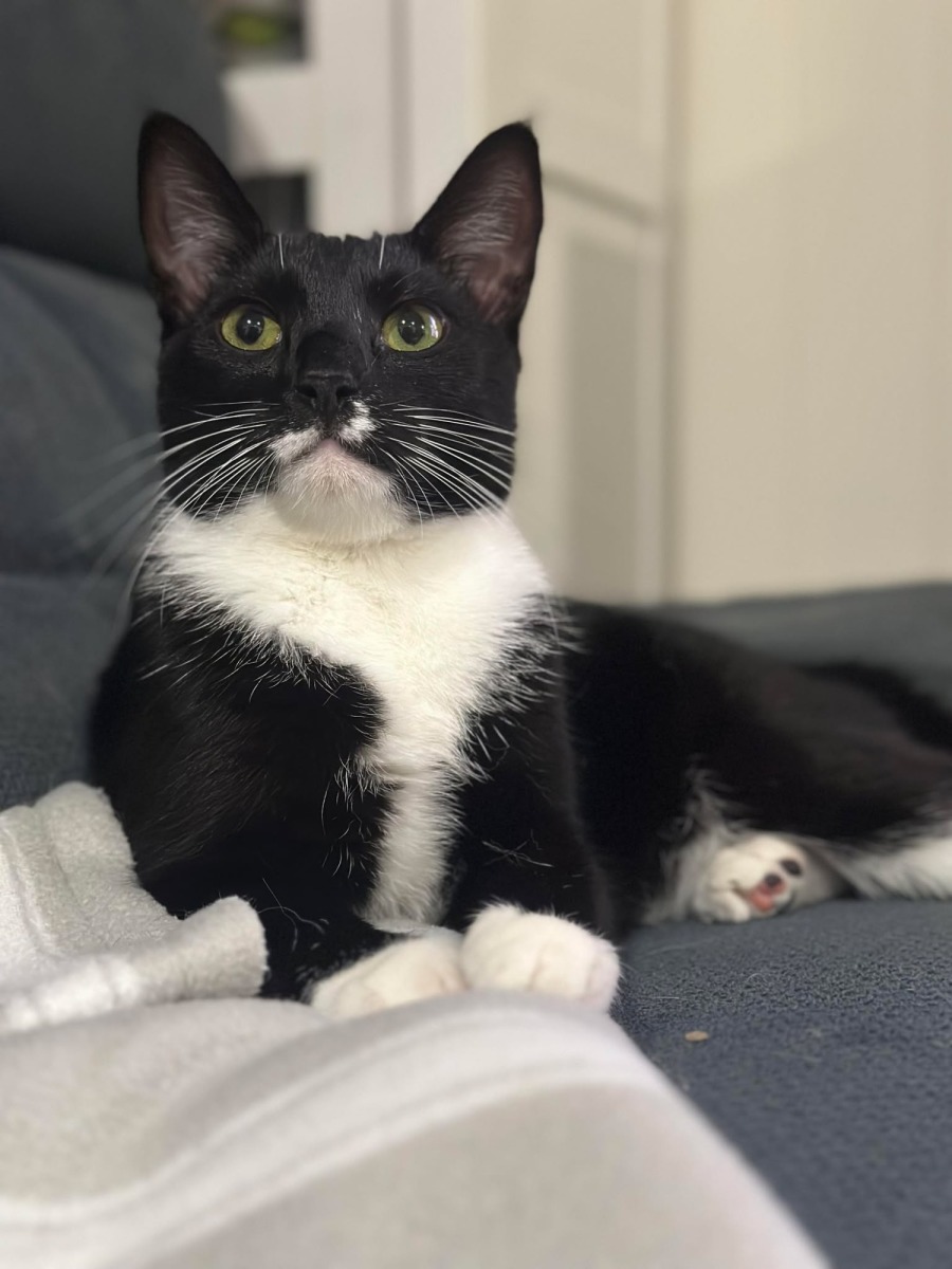 Meet Peppercorn, the cute tuxedo with a whole lot of character packed into her sleek black-and-white suit. This girl has a spark for playtime that could power a small village – she will happily chase toys and is deeply committed to her part-time job as a laser-pointer hunter.