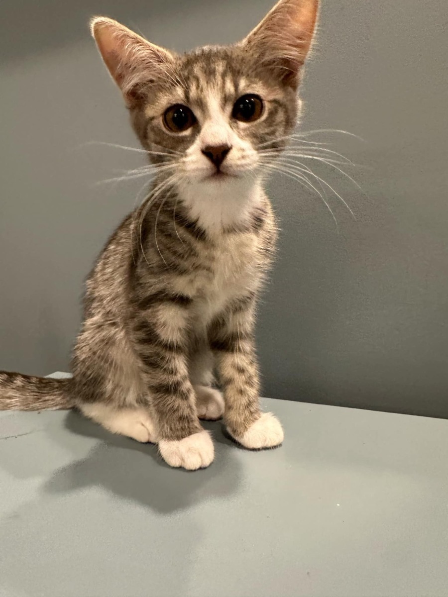 This tiny little girl is the smallest in her litter - with big beautiful eyes. Her little size doesn’t stop her wrestling & playing with her siblings. She likes to assess & situation before jumping in. Would do well adopted with a sibling and or another cat home! Loves to play and enjoys her food.