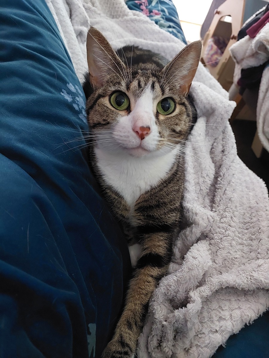Cleo is an irresistibly charming feline with beautiful big eyes that capture hearts and a personality that is too delightful to forget. This chatty little lady is sure to win you over with her friendly and confident demeanor, as well as her adorable habit of "making biscuits" on soft blankets. Cleo will fill your home with warmth and laughter.
