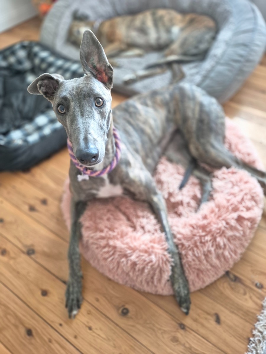 My foster mum says I’m lucky, and I feel that way too because now I live with three other greyhounds and a whippet! One of them is my age, and we love playing bitey face and tug-of-war with all the toys I have now.