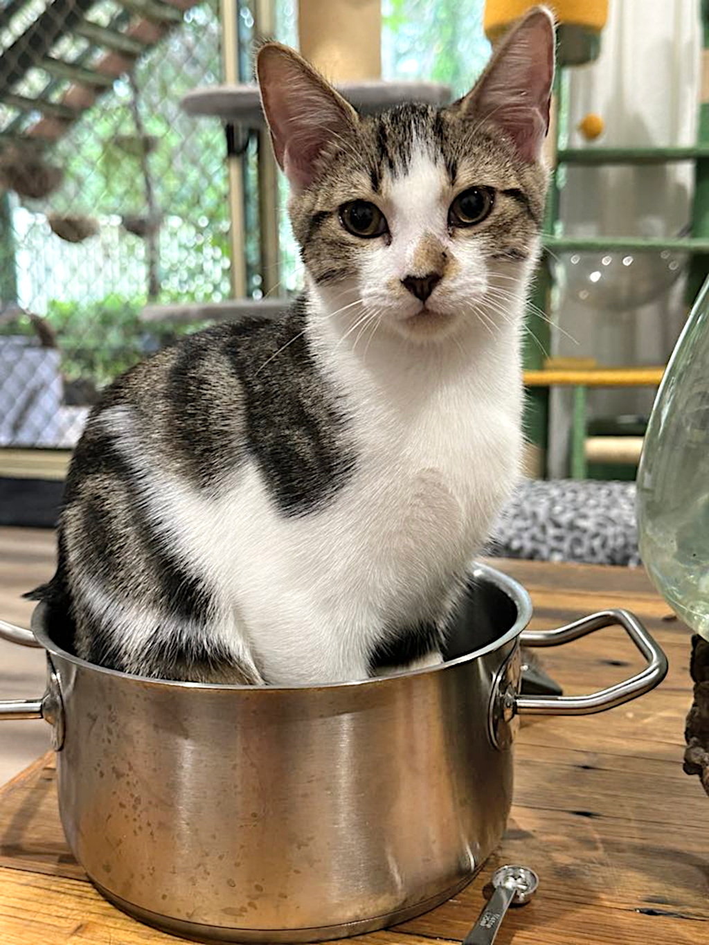 Pippin is the ultimate lap-cat! If you sit, he is on your lap before your tail hits the cushion. And if you are not sitting, he is waiting for you to sit! Curious by nature, Pippin is the first to explore new things, empty boxes, paper bags, you name it, he is right there.