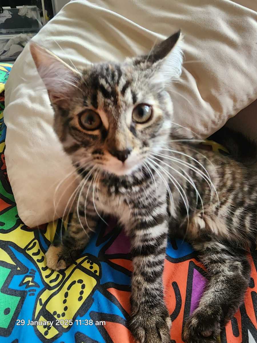 Introducing the delightful Miss Missy, the tortie tabby with a vibrant personality and an abundance of charm. She's a social butterfly, often seen frolicking with her beloved siblings, Nala and Sabrina. Together, they form an inseparable trio, and you can often find them playing, napping, or simply enjoying each other's company.