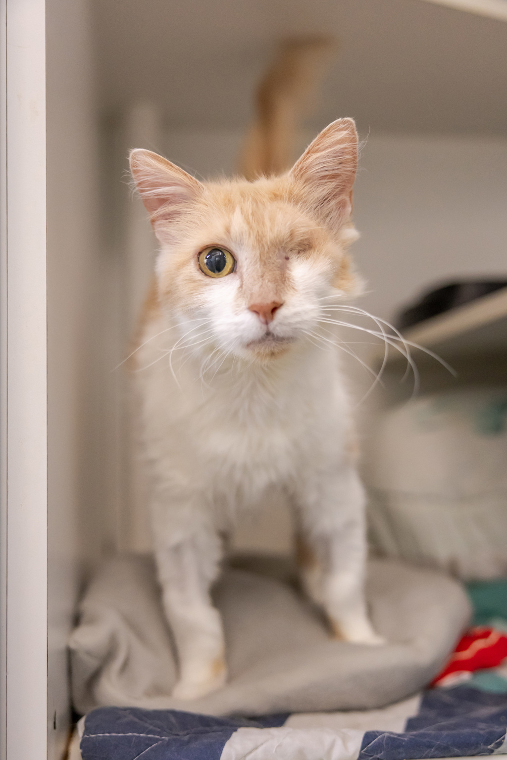 Biscuit may have only one eye, but don't let that fool you-she doesn't miss a thing! Whether she's curiously watching the world go by from a sunny windowsill or following you around for a chat, she's always keeping tabs on her favourite humans. She's an expert in head boops, a connoisseur of couch snuggles, and has a purr that could melt hearts.