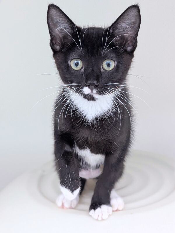 Hello there, my name is Boots! I'm a 2 month old female Domestic Short Hair kitten with a playful spirit and lots and lots of energy. I love exploring my surroundings, chasing after toys, and of course, playtime! I'm also quite the cuddle bug and I definitely won't say no to a warm lap to curl up in. My fur is short and soft, perfect for petting sessions. I'm looking for a forever home where I can grow, play and receive lots of love. I'm pretty easy-going and I don't have any known child-related issues, so I should fit right into any family setting. Can't wait to meet my forever family, could that be you?