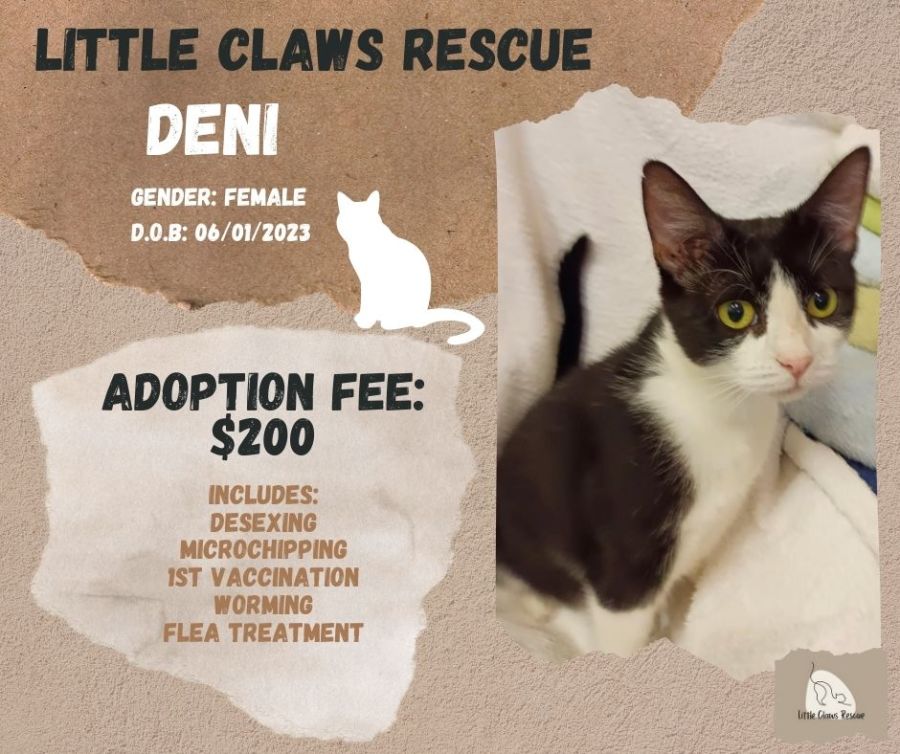 Meet Deni, a charming cat with a captivating personality that's impossible to resist. She's an affectionate feline who adores being around people and thrives on interaction. Deni's sociable nature shines through in her love for following you around, ensuring you're never without a steady stream of her delightful company. Her expressive nature makes her quite the conversationalist, and she'll happily fill your home with soft meows and purrs.
