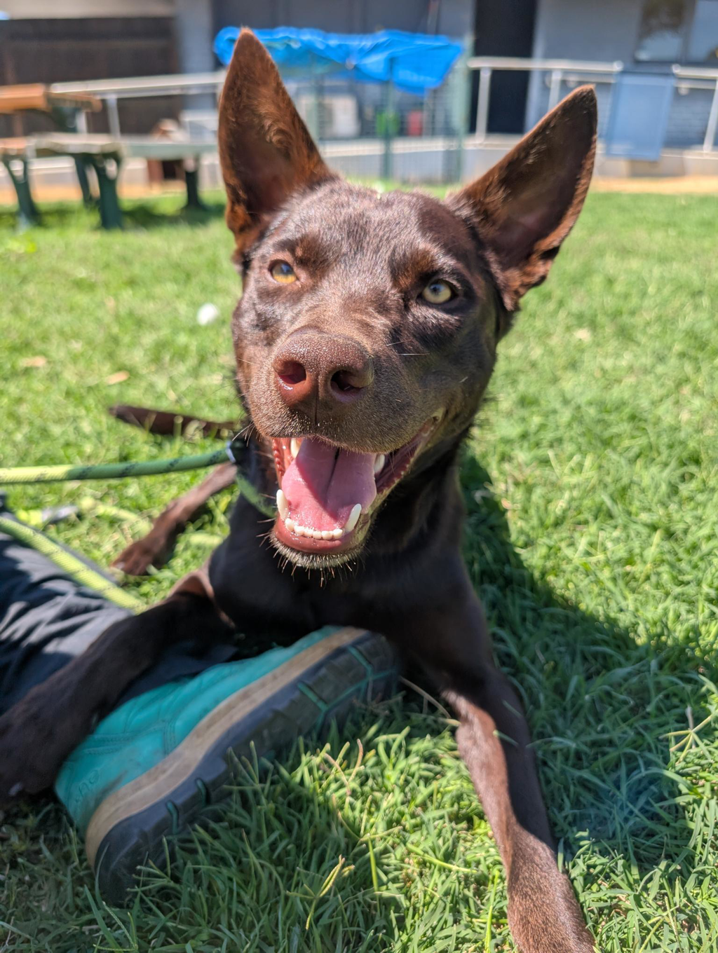 Choko is the perfect mix of playful and loving. His first-ever bush walk was a huge success, and he made fast friends with all the other Kelpies here. He's outgoing, confident, and loves making new pals, whether they're furry or human.