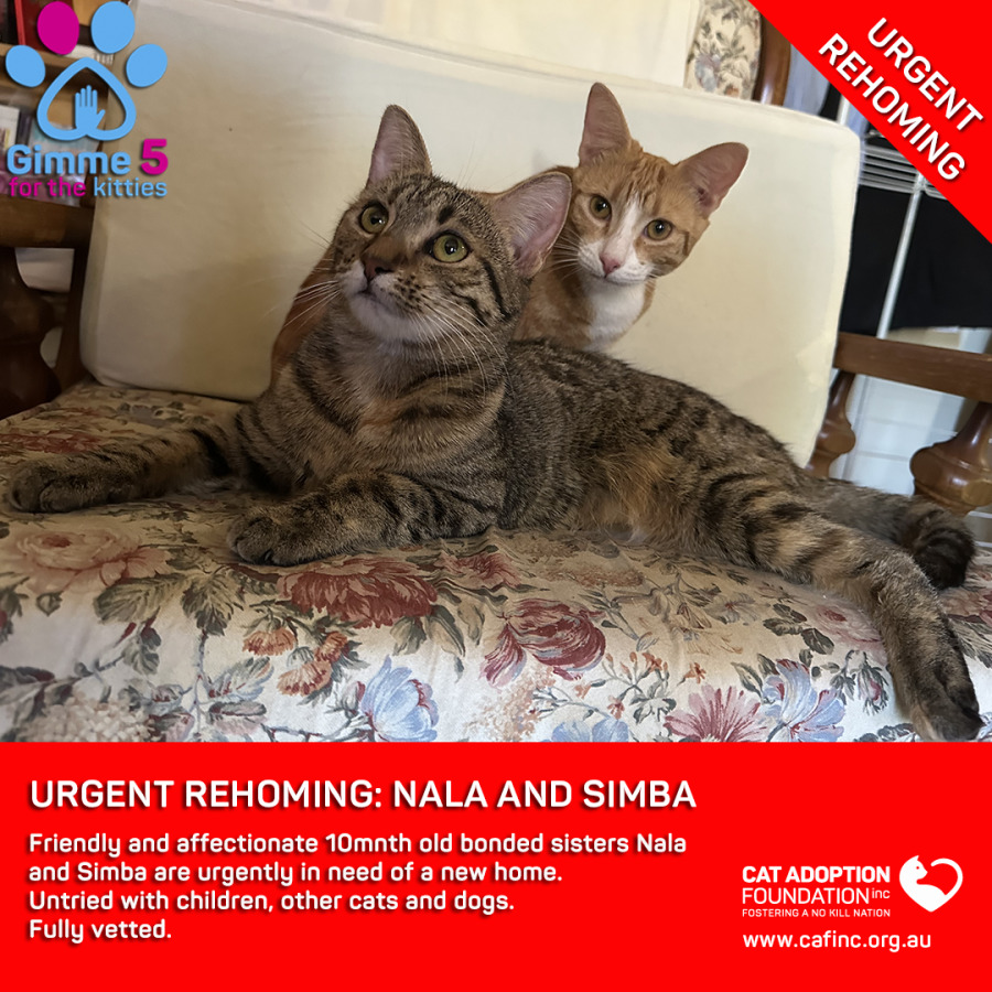 Donate to Nala & Simba Private Rehoming No Charge! at Cat Adoption Foundation Incorporated via Shout