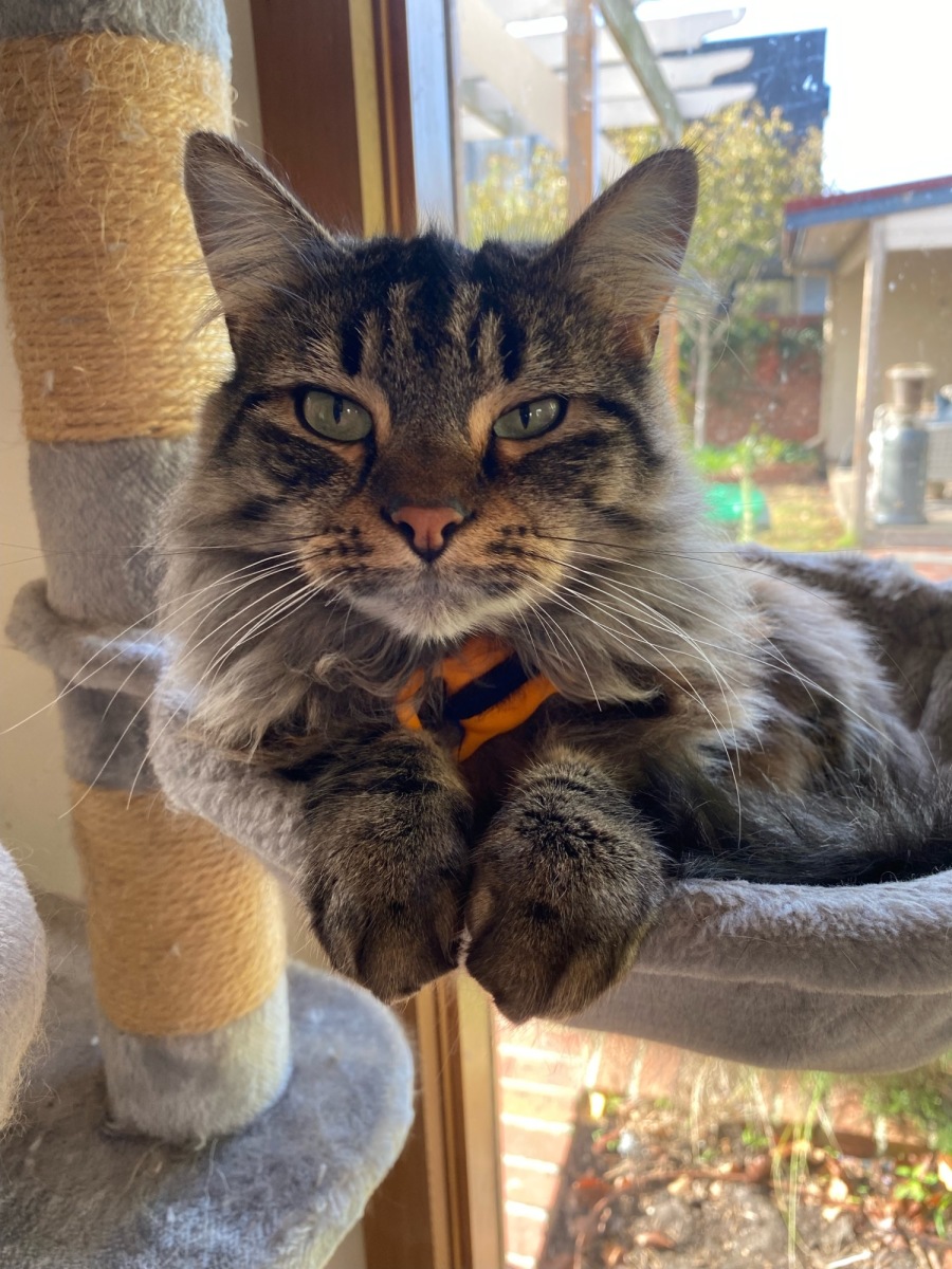 Clover loves to let you know all about her day. She is a medium haired tabby who recently had a haircut due to excessive matting from being outside.