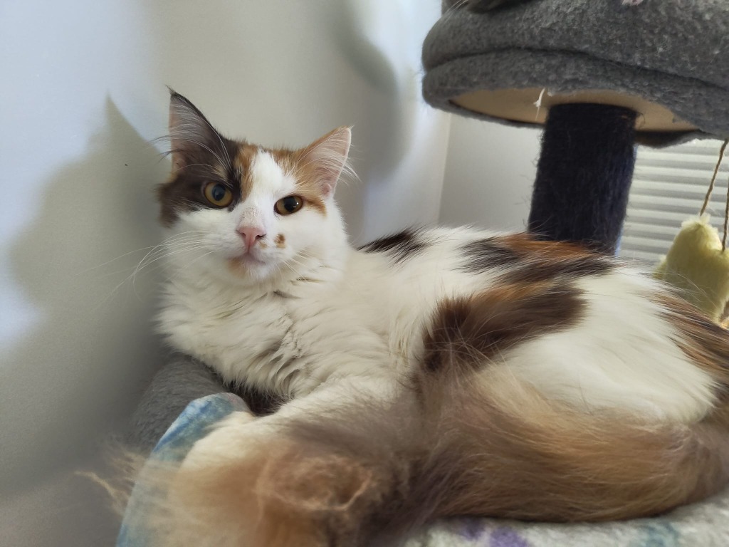 Stunning Mango is a soft and gentle girl with a sweet nature. She just loves other cats and would be good in a household with any number of cats. She loves being brushed (she has the silkiest fur ever) and getting head and chin scratches but can spook if humans come at her quickly while she's on the ground. She prefers her humans to approach her slowly or while she's relaxed.
