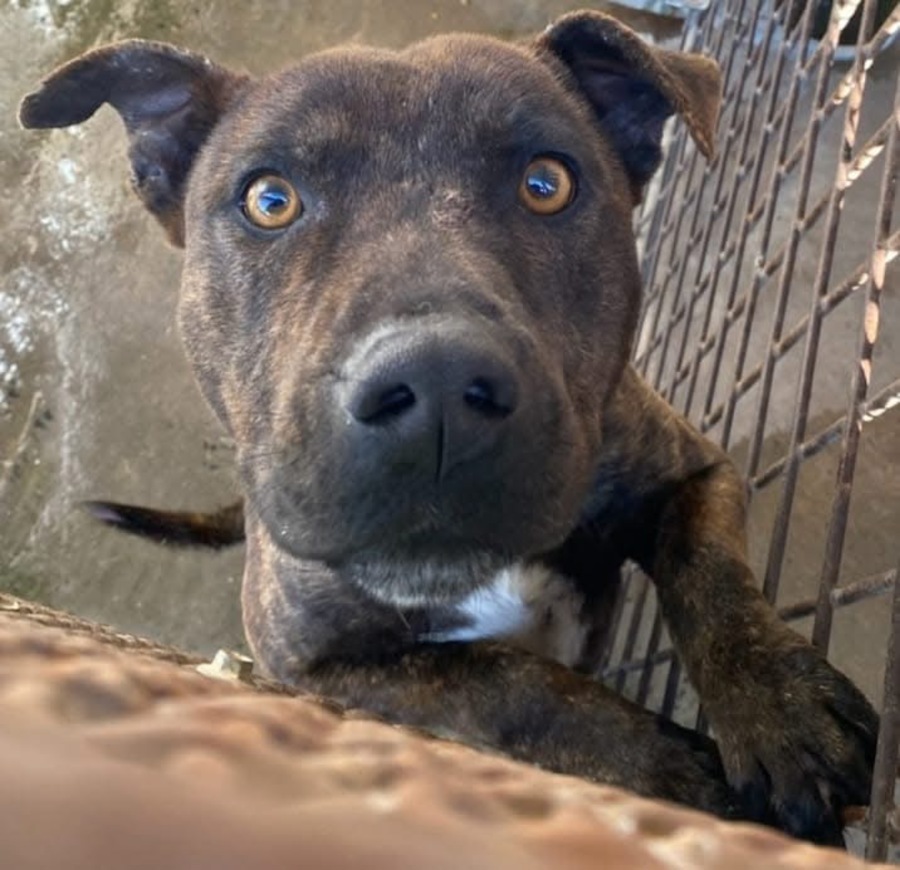 Hi there, my name is Popcorn and I am a very friendly male dark brindle Staffy!