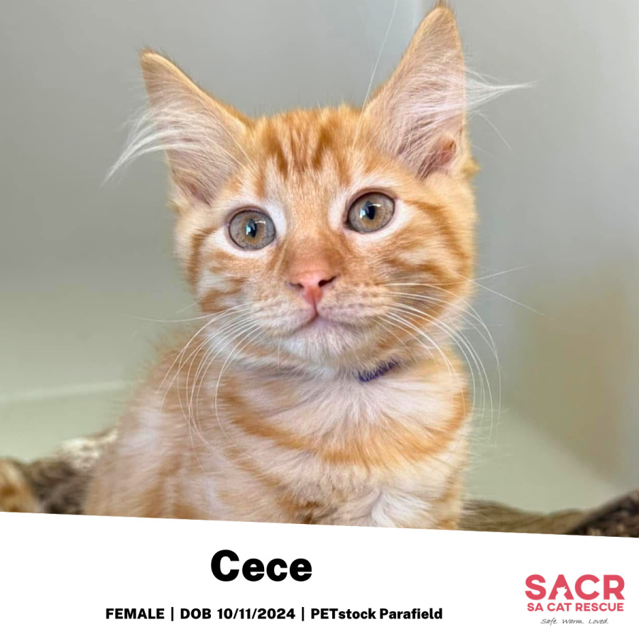 Meet Cece, a captivating kitty with a beautiful, soft coat that you'll fall in love with instantly. This delightful lady strikes the perfect balance between independence and affection, making her a wonderful companion for those who appreciate a little sass with their cuddles. Cece is playful and mischievous, with an endless capacity for inventing games that will keep both her and her new family entertained for hours.