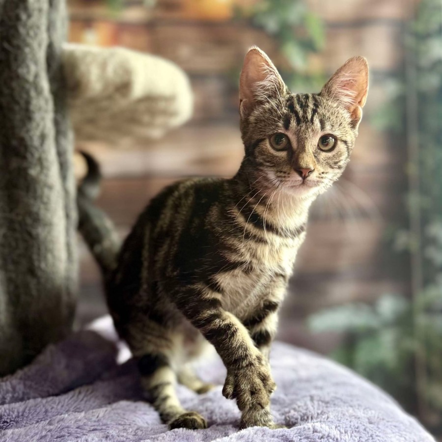 Blossom is a beautiful tabby kitten with a sleek, striking coat and a heart full of love. Just like the flowers in spring, she brings warmth and happiness wherever she goes. The moment you scoop her up, she’ll start purring away, completely content in your arms.