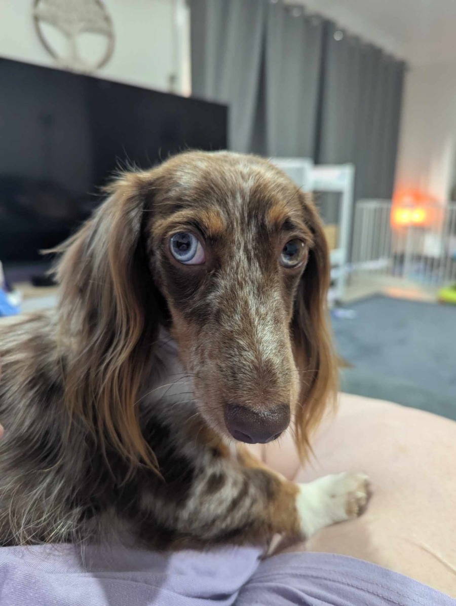 Sassy the Dachshund is a sweet and loving pup with a heart as big as her floppy ears. She has very expressive eyes and a stunning coat. Despite her small size, she’s full of personality and affection, always ready to snuggle up for some quality cuddle time. Sassy has a sensitive side, as she struggles with separation anxiety, making her happiest when she’s close to her favorite humans. She thrives in a calm, understanding environment where she can feel safe and secure. With patience, love, and plenty of belly rubs, Sassy is sure to become a loyal and cherished companion for anyone willing to give her the reassurance she needs. Sassy being a Dachshund is reactive to cats so must go to a cat free household. She will be sure to bark when someone comes to the door as all the best guard dogs do and lives up to her name.