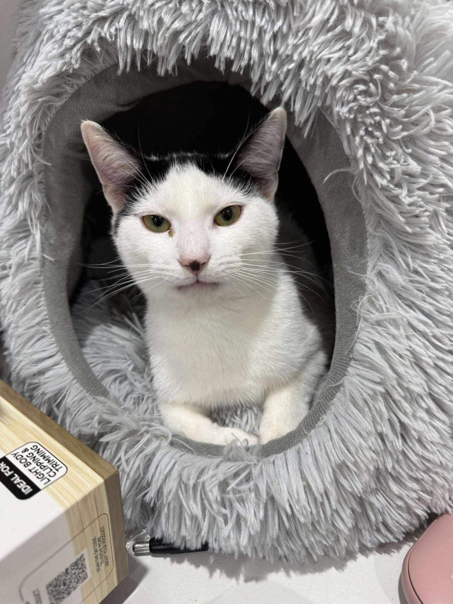 Cheeky yet reserved, Silas has a subtle way of making his wishes known and maintains a quiet dignity as he goes about his day. You might catch him peering curiously from beneath a table or investigating a shadowy nook with his soft steps.