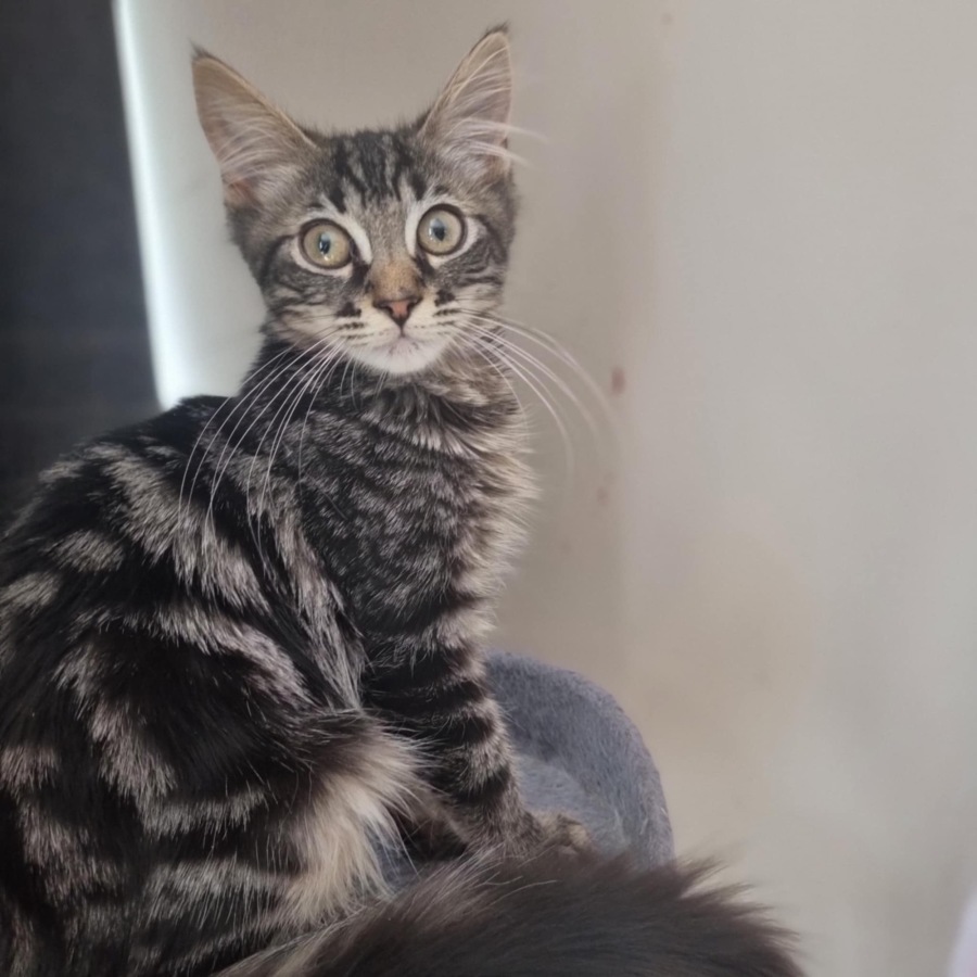 Iggy is a 4mth old desexed mainecoon x domestic med hair kitten with a lot of personality .